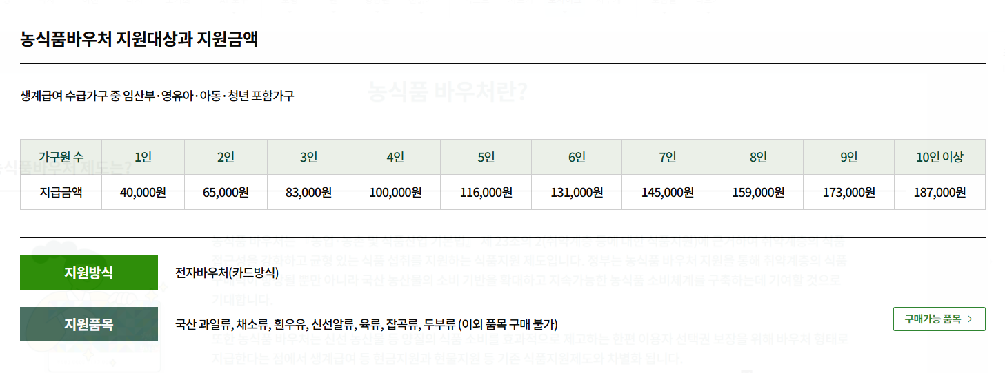 현금 지급이 아닌 전용 카드 방식으로 운영되며, 지정된 사용처에서 국산 신선 식재료를 구매하도록 설계돼 있습니다.