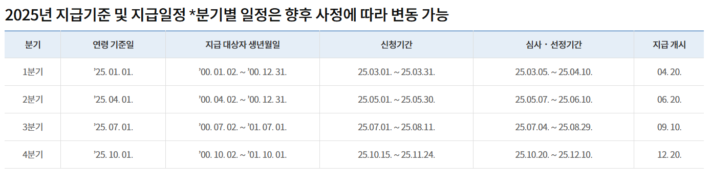 이번 분기 지원 대상은 2000년 10월 2일 ~ 2001년 10월 1일 출생자로, 신청일 기준 경기도에 주민등록을 두고 있는 만 24세 청년입니다.