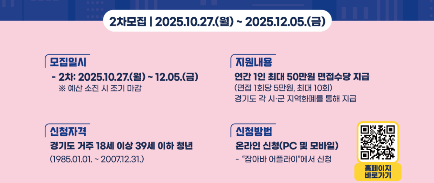 경기도에 거주하는 만 18세~39세 청년이 실제 면접을 본 경우, 면접 1회당 10만 원을 지급받을 수 있습니다.
