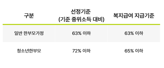 한부모가정 자격조건은 기준 중위소득 63%(청소년한부모 65%) 이하인 경우에 적용됩니다.