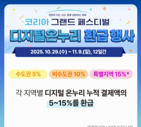 이 행사는 디지털 온누리상품권 결제금액의 지역별로 5~15%를 동일한 상품권으로 환급해주는 구조입니다.