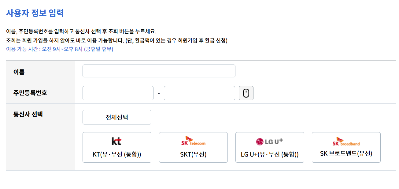 ● KT: KT 미환급금 조회 페이지
