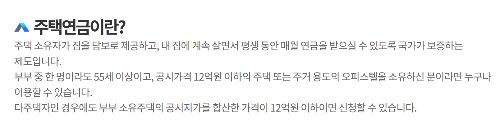 주택연금 가입조건은 만 55세 이상, 부부합산 공시가격 12억 원 이하 주택 보유가 기본입니다.