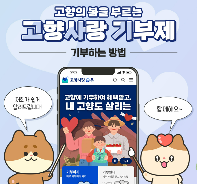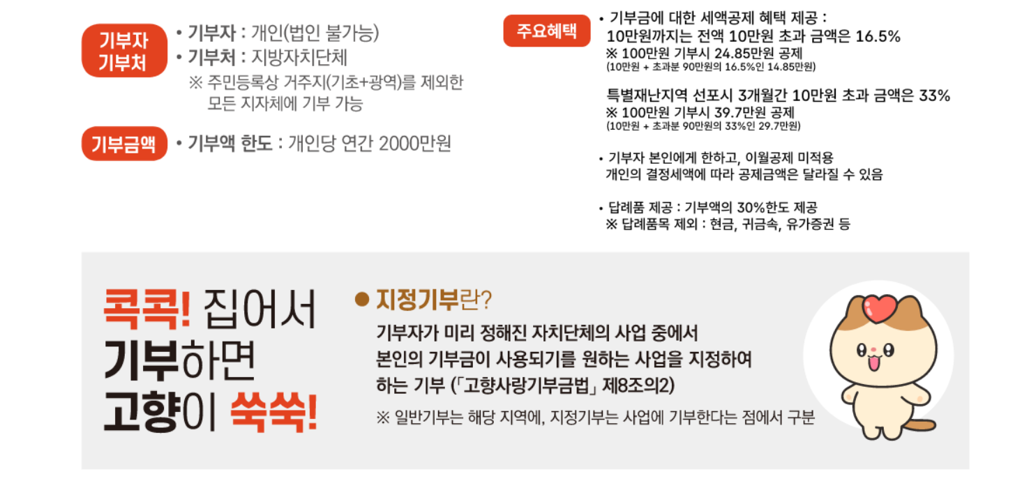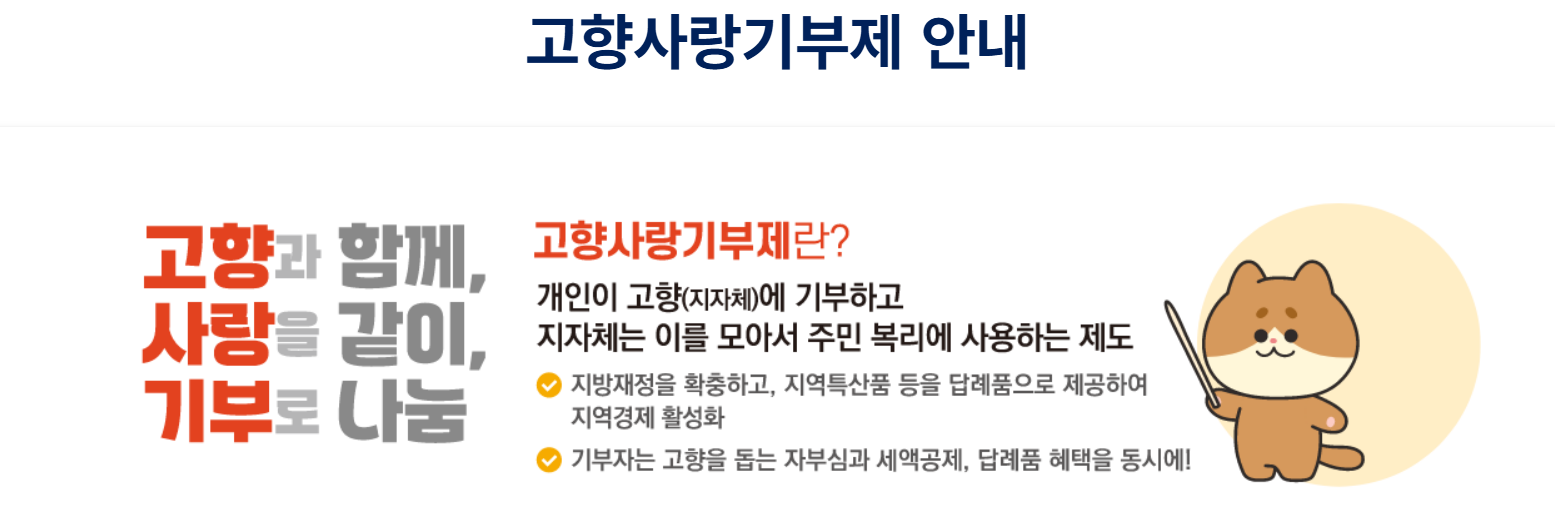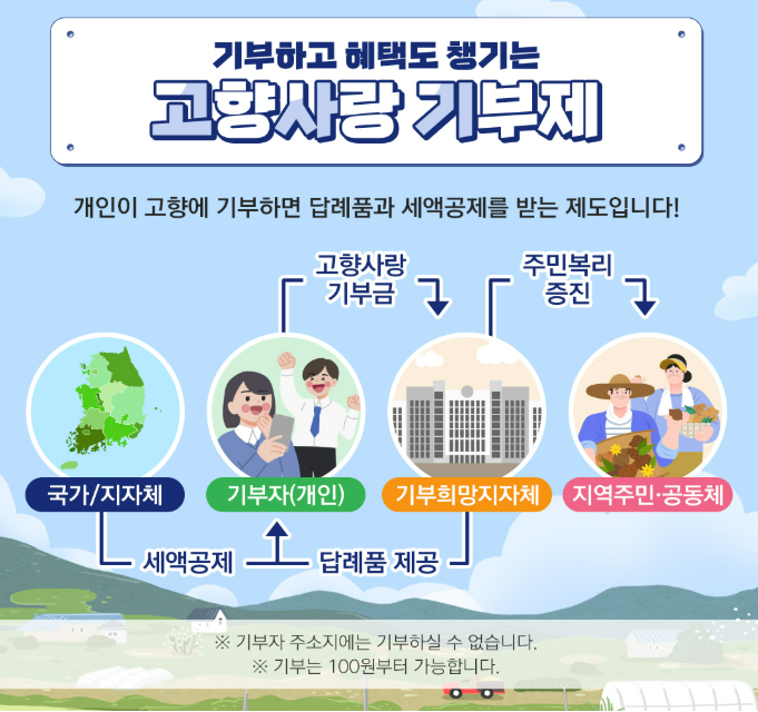 고향사랑 기부제는 거주지를 제외한 지자체에 기부하면 일정 비율의 답례품과 세제상 혜택(법정 한도 내)을 받을 수 있는 제도다.